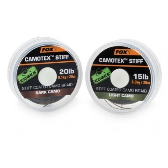Stijve Gecoate Camo Braid. Camotex Stiff is een zachte soepele gecamoufleerde zinkende braid voorzien van een stijve matte camo coating, die door stomen perfect recht wordt, voor het creëren van geavanceerde combi rigs. We adviseren de coating te verwijderen voor u er een knoop in legt. Leverbaar in Light Camo en Dark Camo in breeksterkten van 15lb, 20lb & 25lb.