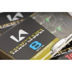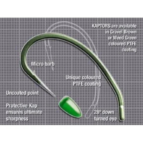 Este gancho representa el mayor avance del ingenio de la ingeniería jamás visto. El diseño altamente crítico podría mejorarse aún más revistiéndolo con PTFE coloreado. Como resultado, la carpa no se enfrentará directamente con una pieza de metal en su boca mientras succiona nuestro anzuelo. El segundo punto importante es que la punta de gancho ultra afilada se ha liberado del recubrimiento. Esto también mejora el fenomenal efecto punzante de estos anzuelos. El hecho de que seamos los primeros en hacer esto demuestra lo importante que es para nosotros la calidad y el desarrollo de productos. Cada punto de anzuelo también está protegido por una tapa y colocamos este anzuelo en un embalaje especialmente desarrollado. Como resultado, no puede pasar absolutamente nada y tienes 100% de certeza cuando comienzas a usar este gancho. El Kaptor Kurv Shank está disponible en los colores de camuflaje Weed Green y Gravelly Brown. Estos colores se han elegido deliberadamente para que el anzuelo no «sobresalga» de ningún modo del fondo. El Kaptor Kurv Shank es un gancho excepcionalmente bueno y es ideal para usar en plataformas especiales como Muzza, KD y Withy Pool.
