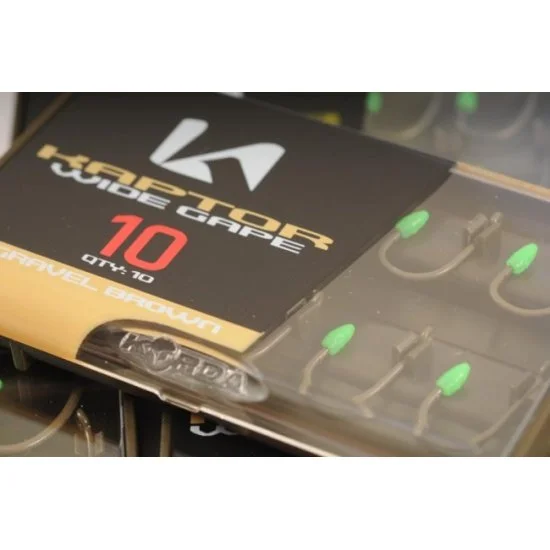 Este gancho representa el mayor avance del ingenio de la ingeniería jamás visto. El diseño altamente crítico podría mejorarse aún más revistiéndolo con PTFE coloreado. Como resultado, la carpa no se enfrentará directamente con una pieza de metal en su boca mientras succiona nuestro anzuelo. El segundo punto importante es que la punta de gancho ultra afilada se ha liberado del revestimiento. Esto también mejora el fenomenal efecto punzante de estos anzuelos. El hecho de que seamos los primeros en hacer esto demuestra lo importante que es para nosotros la calidad y el desarrollo de productos. Cada punto de anzuelo también está protegido por una tapa y colocamos este anzuelo en un embalaje especialmente desarrollado. Como resultado, no puede pasar absolutamente nada y tienes 100% de certeza cuando comienzas a usar este gancho. El Kaptor Wide Gabe está disponible en los colores de camuflaje Weed Green y Gravelly Brown. Estos colores se han elegido deliberadamente para que el anzuelo no «sobresalga» de ningún modo del fondo. El Kaptor Wide Gabe es un gancho excepcionalmente bueno y es ideal para usar en plataformas especiales como Muzza, KD y Withy Pool. El Kaptor Wide Gape es un gancho muy universal que se puede usar para paisajes y presentaciones emergentes como Adam Penning Claw Rig o Danny Fairbrass pop up corn rig.
