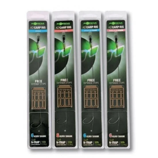 Una combinación de la posición del pelo y un cebo equilibrado ayudará a sujetar el anzuelo la mayoría de las veces. Estas versiones listas para usar cuentan con anzuelos N-Trap y Kurv Shank, que han demostrado ser los mejores componentes para este equipo. Los aparejos KD Carp están disponibles tanto en lengüeta como en lengüeta y en versiones X-Strong Euro con N-Trap de 30 lb.